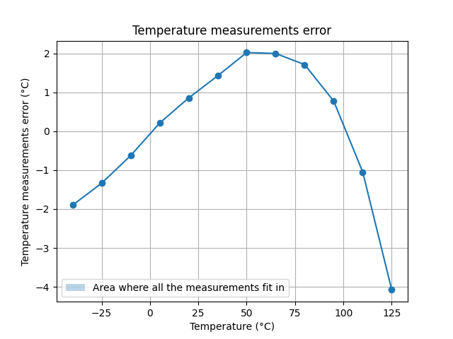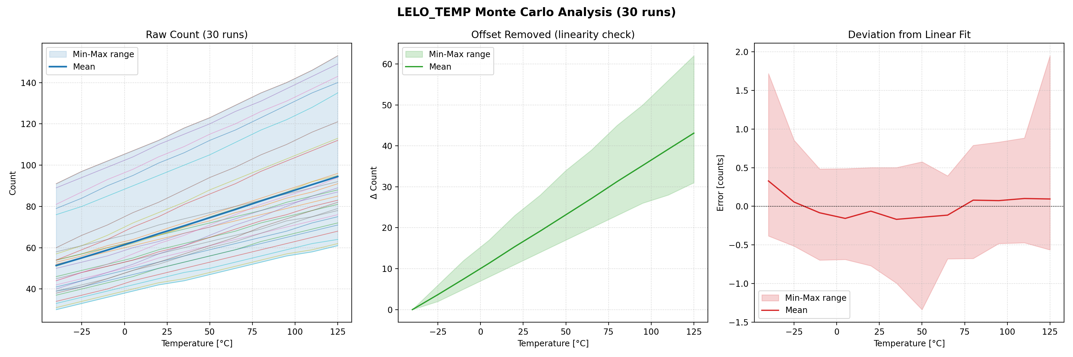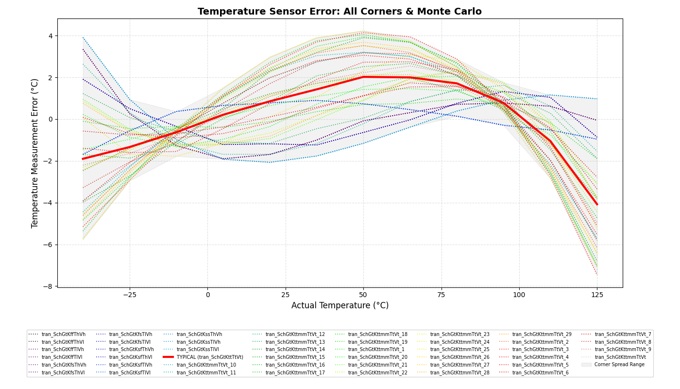 Figure 7: Estimated error in the temperature measurements with two points calibration for extreme test conditions Montecarlo simulations. The results are well within spec, as the plot shows around +2.0 C error peak within the 0-70 C range. Though it must be noted that these measurements are BEFORE being fed through the digital part, so quantization is not visible here.
