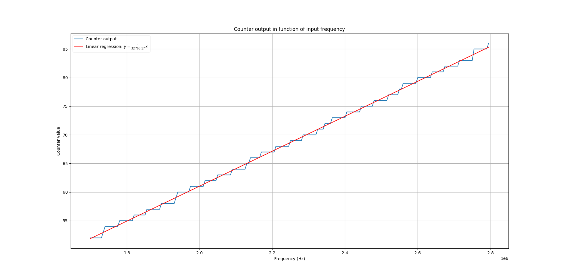 We can plot the output of the counter in function of the oscillator frequency, as shown in the next figure: