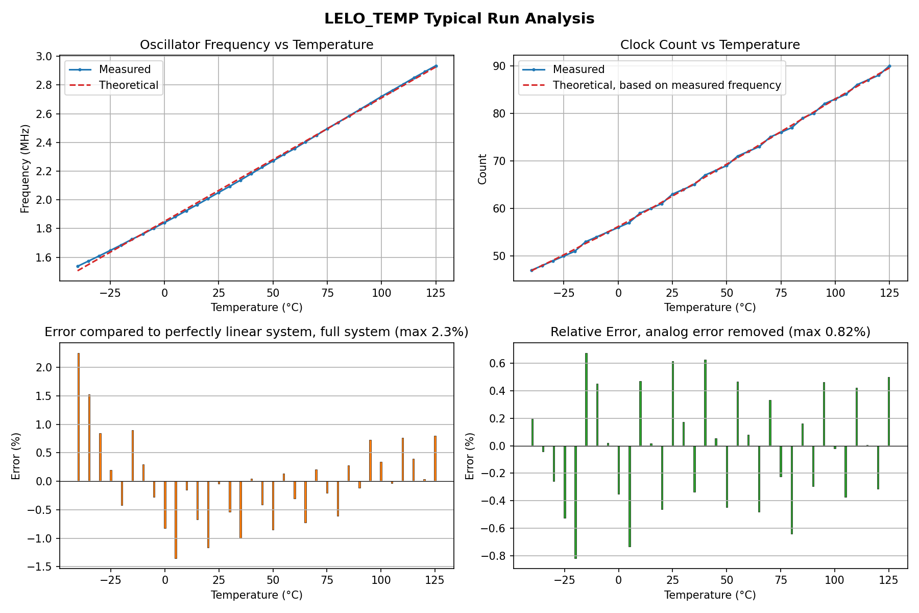 Figure 8: Several plots showing different aspects of the full system. Top left: The oscillator frequency compared to a linear approximation. Top Right: our “count” compared to a perfect theoretical float count. Bottom left: Total error of all parts (digital and analog) per measurement in percent compared to a theoretical perfectly linear system. Bottom right: The digital error, analog error removed