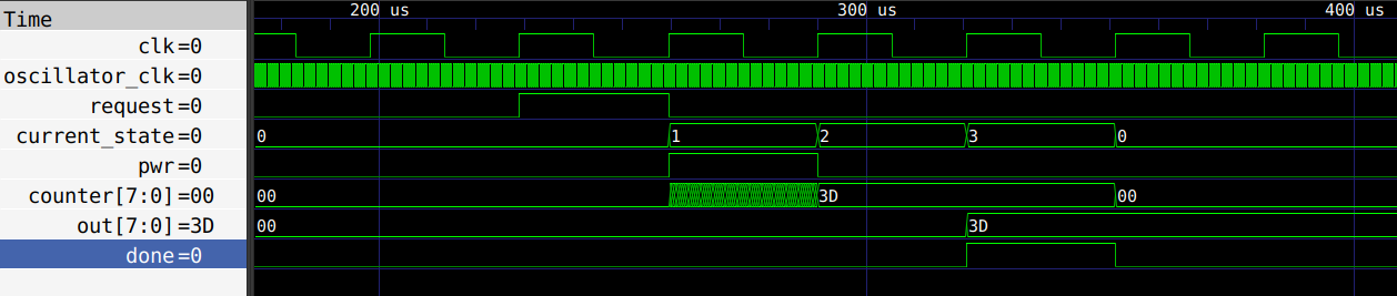 When the request signal is received, the FSM start to power up the analog part and count the number of pulses generated by oscillator in the internal variable counter. Next, it powers down the analog, puts the value of the counter variable in the out variable and generate a pulse through the done wire to indicate the end of the measurement. In this example we get 0x3D pulses (in hexadecimal, or 61 in decimal) during one period of the reference clock.