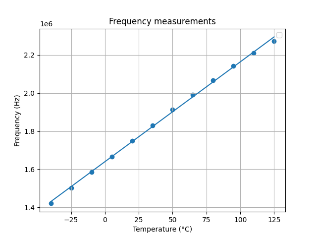 As expected, the linear regression tells us that the number of pulses is equal to the oscillator frequency divided by the reference clock frequency. To reduce the quantization noise it is possible to reduce the reference clock frequency so the FSM can count more pulses in one period.