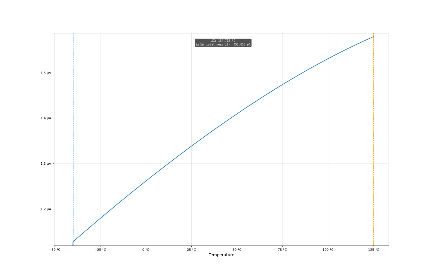 Figure 1: IPTAT simulated with a sweeping temperature between -40 and 125 degrees C. A 1k resistor has been placed between IPTAT node and ground to measure this.