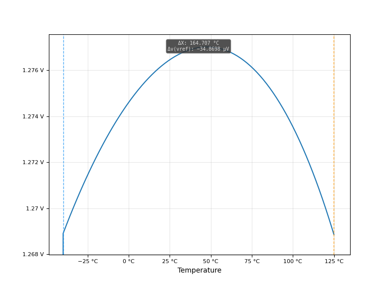 Figure 2: VREF simulated with a sweeping temperature between -40 and 125 degrees C. It is quite constant, with a tiny delta between the startpoint and endpoint, and nearly centered peak.